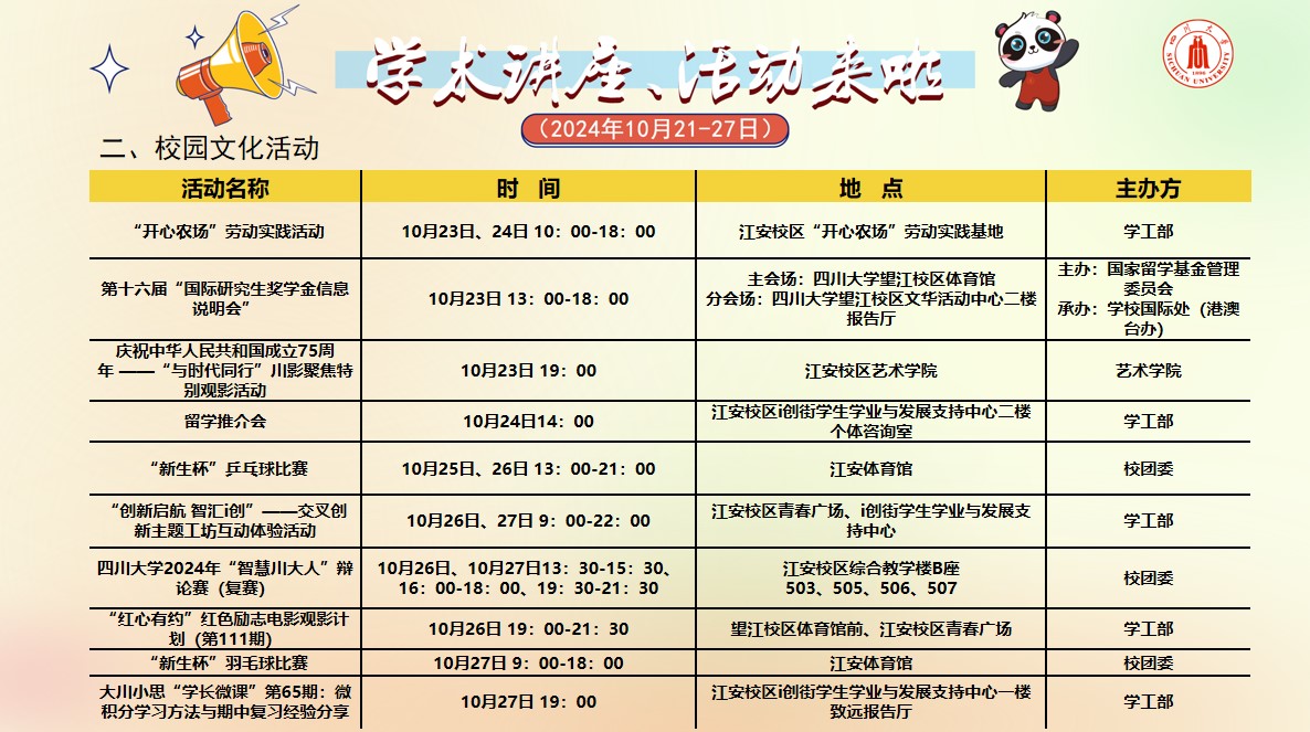黄色视频 2024年10月21日-27日学术讲座论坛及校园文化活动预告