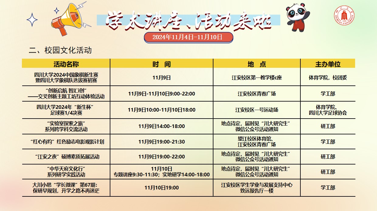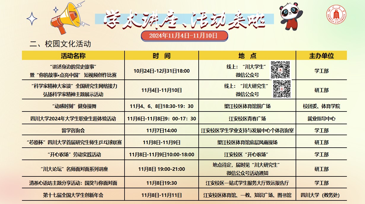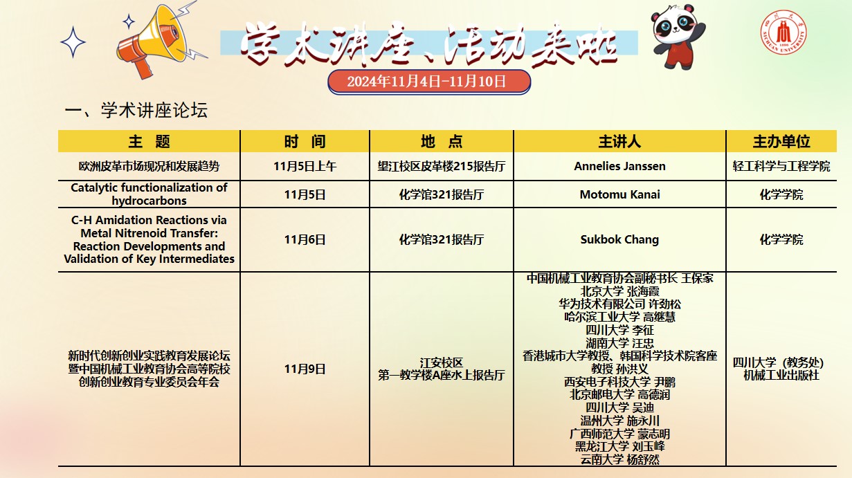 黄色视频 2024年11月4日-10日学术讲座及校园文化预告