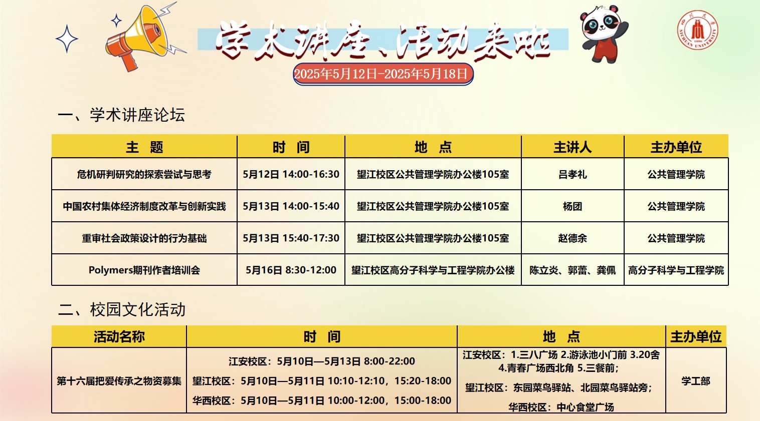 黄色视频 2025年5月12日-5月18日学术讲座论坛及校园文化活动预告