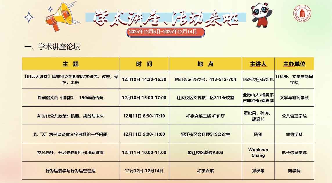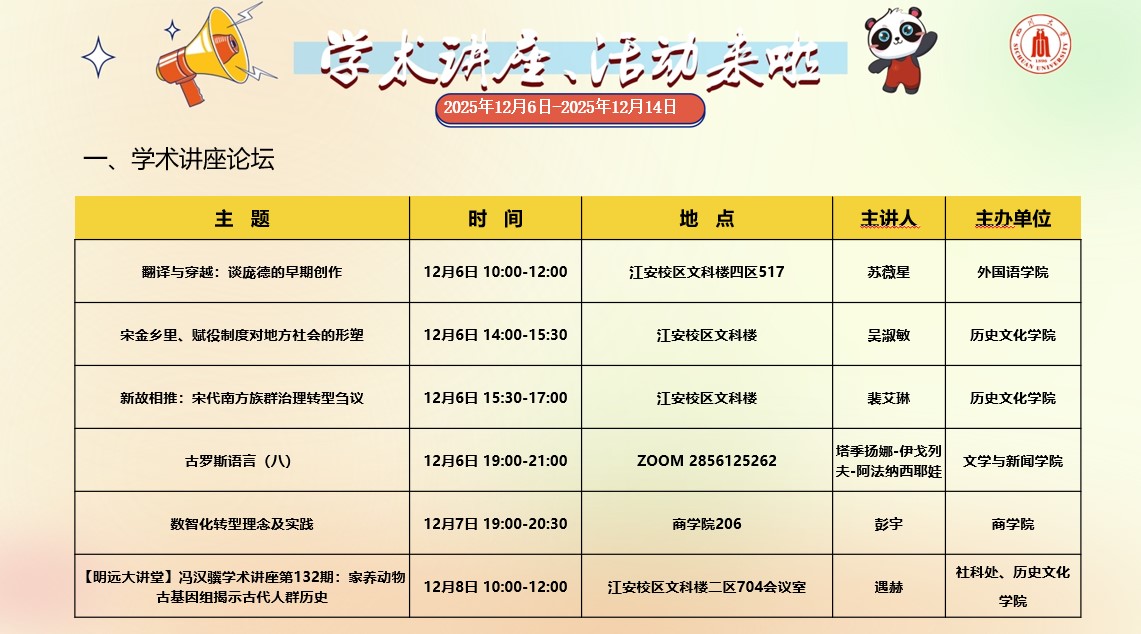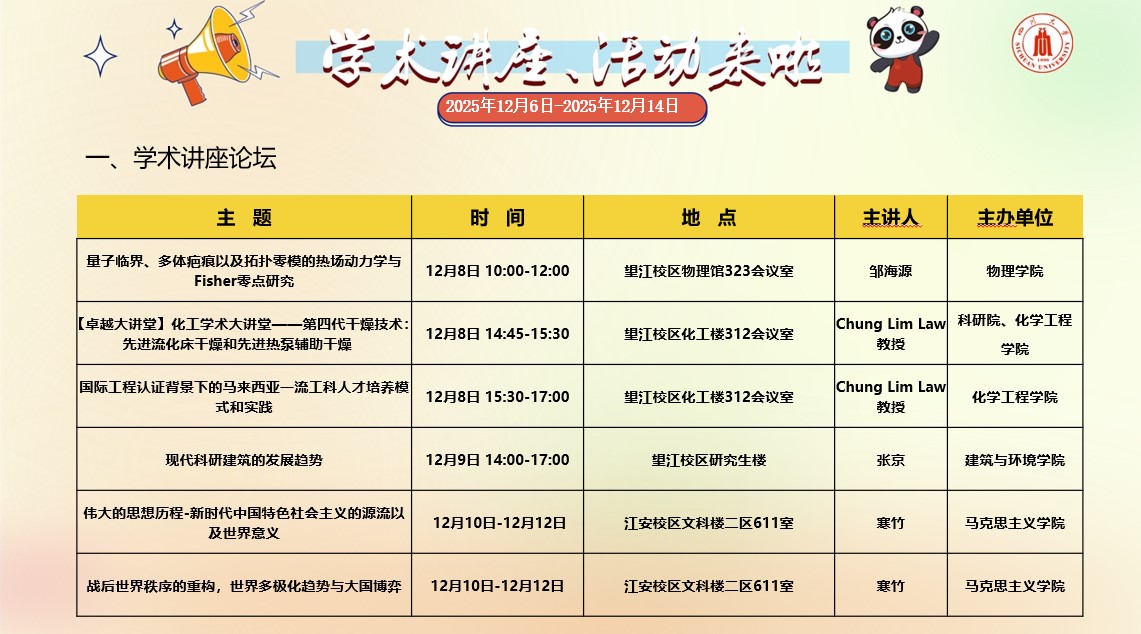 黄色视频 2025年12月6日-2025年12月14日学术讲座和校园文化活动预告