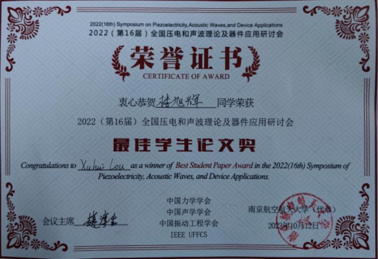 由力学系蒋文涛教授科研团队青年教师田晓宝、范海冬、周志宏、李英琪老师参与指导的楼旭辉、熊华杰、王娜、崔少晗、吴主龙和赵明共6名学生在会议中进行了报告。分别在学生竞赛报告和分组报告中报道了学院在多晶铁电晶界、压电弯曲波、压电表面润湿行为、结冰传感器以及结冰测量系统方面的最新研究成果。报告受到与会专家的高度肯定,其中硕士研究生楼旭辉同学获大会“最佳学生论文奖”(全国仅6个),是黄色视频