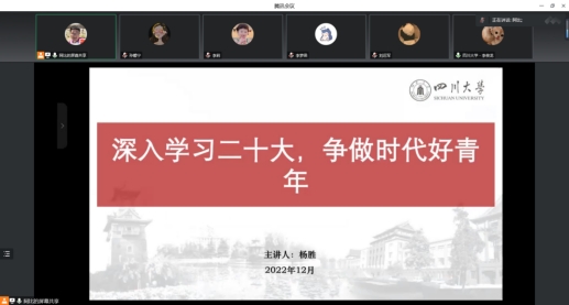 12月27日,学院研究生一年级一支部开展“党的二十大精神”线上学习主题活动。支部书记杨胜作题为“深入学习二十大,争做时代好青年”的主题分享报告,支部党员曾夕丁、刘运军、李俊龙分享了近期学习二十大精神的心得体会。学习活动由支部书记杨胜主持,支部全体党员同志及入党积极分子参与学习。