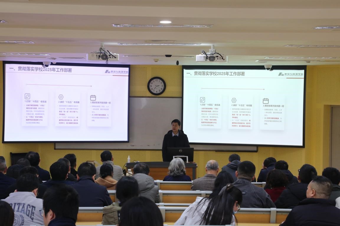 院长戴峰首先传达了学校2025年新学期工作布置会精神。戴峰指出,学院新的一年工作将紧紧围绕打好“十四五”收官战、做好“十五五”布局、用好改革开放关键战略这“三好”展开。针对学院重点工作,戴峰做了安排部署,强调必须坚持立德树人根本任务,全面推进研究生工作,持续强化师资队伍建设,切实提升科研核心竞争力,大力拓展国际合作与交流,促进校友与院地合作,努力打造一流服务保障体系,营造创事干业良好氛围。科学化实施考核调整,不断实现资源优化配置,推进学院各项事业实现一流建设发展,为贯彻落实全国教育大会精神、建设教育强国书写建环篇章、贡献建环力量。