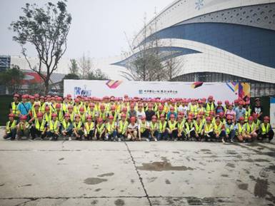 之后,中建一局成都融创文旅城万达茂项目技术总工为学生们详细的介绍了万达茂项目的施工管理技术,包括BIM技术的运用、高支模的精心策划、大体量钢结构安装方法等。在对项目在理论上有了比较清晰全面的认识后,130名学生被分成了四个小组,在项目四个技术管理人员的带领下分别进行了现场观摩。现场观摩包含了入场安全教育、VR安全体验、施工样板段讲解、全国最大钢筋混凝土结构室内滑雪场内部实景参观等内容。