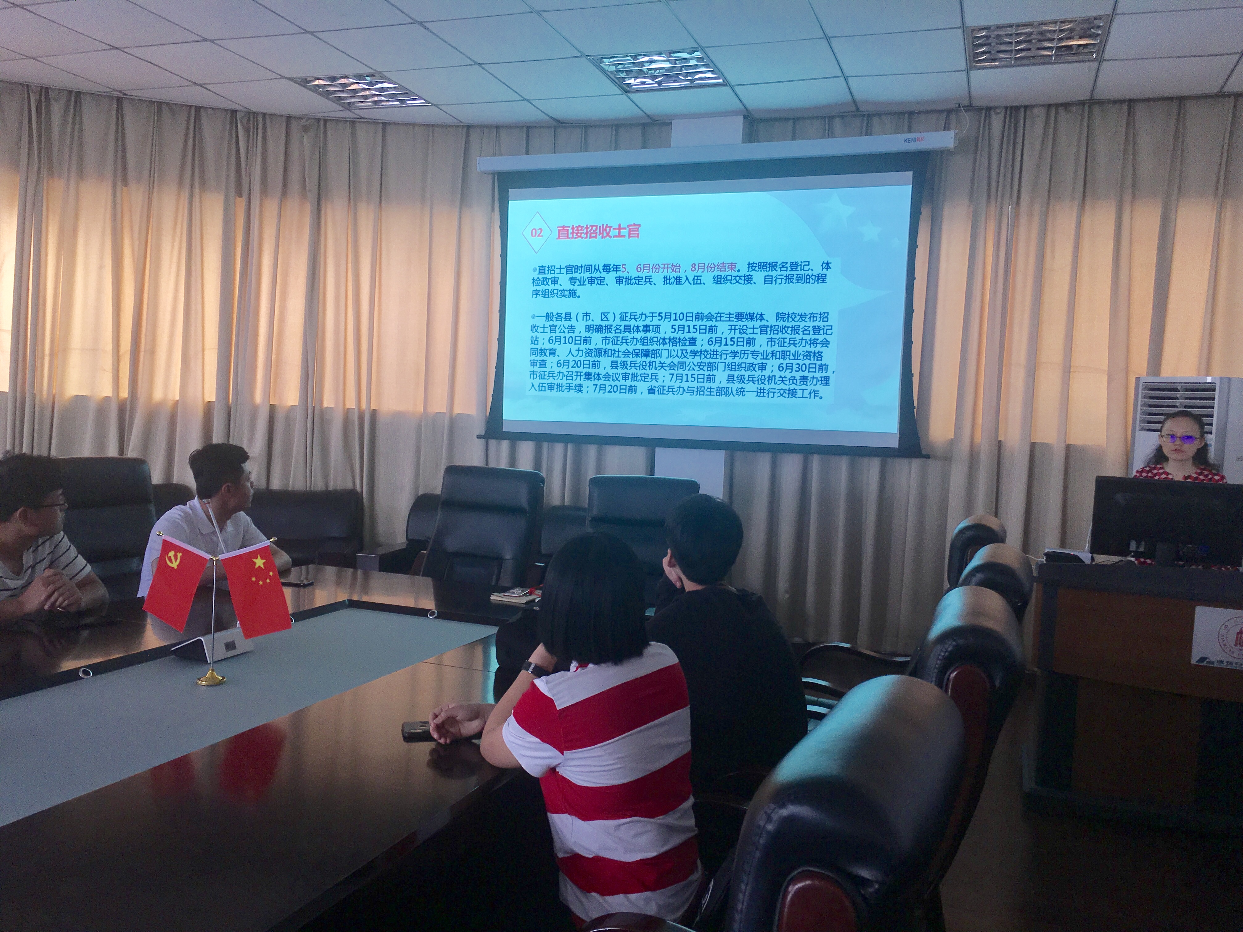 2019年大学生征兵工作专题培训会和全国大学生征兵宣传工作视频会议,及时了解大学生征兵工作的相关政策、具体程序,第一时间将会议精神传达给征兵宣传小组成员。随后学院召开了征兵宣传工作部署会,将大学生征兵工作纳入国防教育和人才培养的的重要内容。