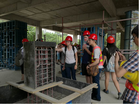 2014级土木工程的全体同学以及来自英国、澳大利亚的19名外国交流学生在阎慧群、丁志斌、钟声、张瑶、游翔五位老师的带领下,乘车前往位于德阳市的四川建筑职业技术学院进行实地参观实习。上午8:30,全体同学到达集合地点,此时下起了暴雨,在去乘车的途中虽然打了伞但身上还是被雨水淋湿,但同学们并没有抱怨,也没有以此为借口不参加实习,11:30到达目的地。