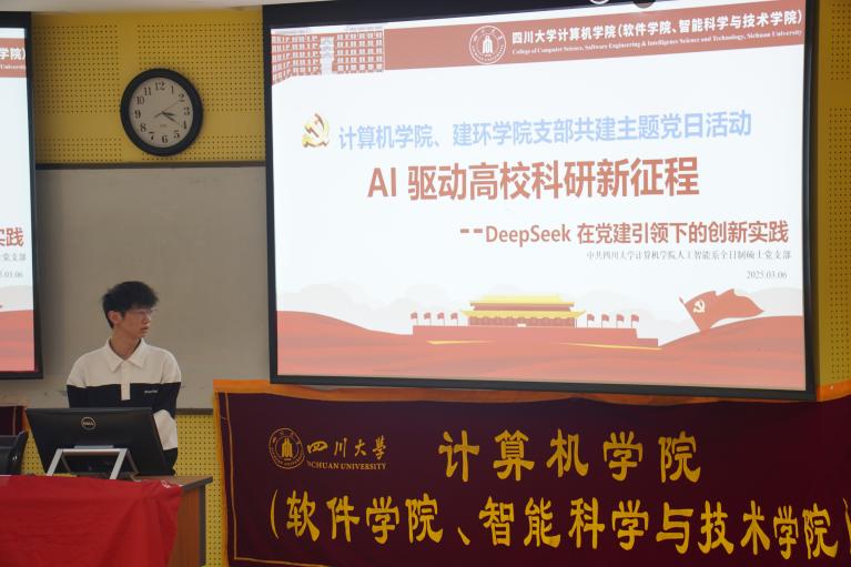 学院江永清同学带来主题为《AI赋能,智护家园:智能震害识别护航现代化中国梦》的报告,展示了AI如何助力抗震救灾、提高建筑智能化水平,从而更好地保护人民的生命财产安全,并向大家展示了运用AI技术进行智能震害识别从而实现更高效的灾害预防和响应机制。计算机学院马鑫同学带来题为《AI驱动高校科研新征程——DeepSeek在党建引领下的创新实践》的报告,详细介绍了人工智能的发展历程、核心技术及其在党建引领下所取得的成果。通过丰富的实例讲解了DeepSeek模型的应用场景,强调了AI在辅助科研写作、论文阅读、知识图谱构建等方面的显著优势。