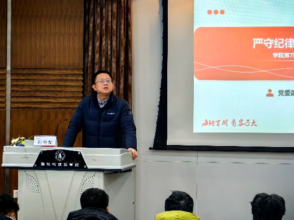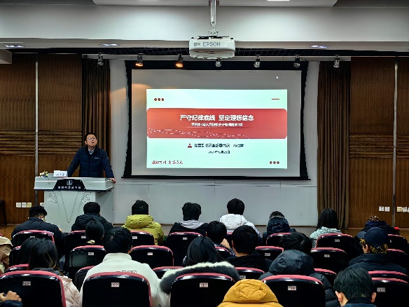 学院党委副书记兼纪委书记孙伯雷作题为“严守纪律底线、坚定理想信念”的报告。知屋漏者在宇下,知政失者在草野。孙伯雷开篇引用“窑洞对”,以及习近平总书记关于自我革命的重要论述,阐明党破解和跳出历史周期律的两个宝贵答案。他带领大家回顾了党的纪律建设历程,明确严明的纪律和规矩是中国共产党的基本特性和宝贵品质。他从纪律、党的纪律、党的纪律建设三个概念层层递进,深刻阐释了党的纪律建设的内涵与外延。法令既行,纪律自正,则无不治之国,无不化之民。他带领同学们深入学习新修订的《中国共产党纪律处分条例》,并细致阐发了六大纪律具体要求。君子检身,常若有过。孙伯雷结合大学生党员常见违规违纪行为典型案例,强调以案为鉴、以案促建、以案促改势在必行。最后他寄语在场同学,希望大家心中有党、心中有民、心中有责、心中有戒。