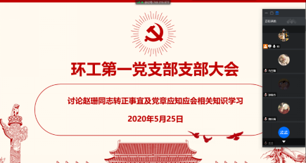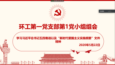 为深入学习贯彻习近平新时代中国特色社会主义思想和党的十九大精神,以爱国主义精神厚植家国情怀。2020年4、5月份期间,学院研究生环工一支部通过线上方式开展主题为“五四精神,传承有我”的小组会以及支部生活会进行爱国主义教育系列活动。