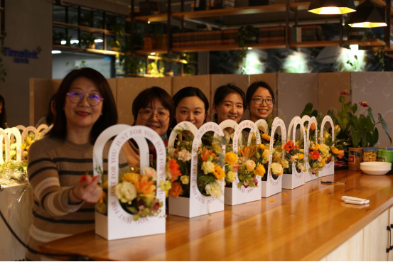 花艺活动现场,女教工们通过花艺师的悉心指导,在了解鲜花种类、花束颜色搭配、插花基本技巧、插花结构与构思等事项后,DIY进行了现场插花创作。她们用心构思、精心创作,对花束的颜色、层次、角度、种类搭配、寓意等进行了大胆尝试。插花结束,一盏盏错落有致、独具匠心、层次分明的花篮精美绽放。女教工们表示,插花不仅释放了她们在教学科研与管理工作中的压力,更陶冶了情操、提升了审美能力。短短半天的茶艺.花艺课程,让老师们忙中偷闲,意犹未尽,难得地享受了生活的惬意与美好。