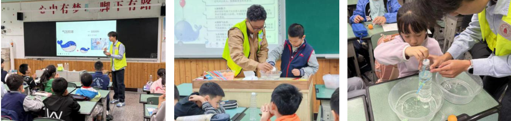 活动围绕4个精心设计的气压实验展开,逐步加深同学们对大气压的认识,课堂现场气氛热烈,互动频繁。同学们对实验现象表现出极大的好奇与兴趣,争先恐后地举手提问;志愿者们耐心讲解,引导孩子们观察、思考并尝试解释现象背后的原理。