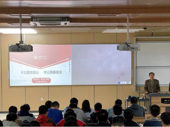 为全面贯彻习近平新时代中国特色社会主义思想和党的十九大精神,深入学习习近平总书记“不忘初心、牢记使命”主题教育工作会议精神,教育引导学院学生守初心、担使命,10月27日,在江安校区综合楼C306教室,学院党委书记蒋文涛给本科生上了一堂“不忘跟党初心,牢记青春使命”的主题党课。
