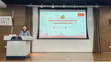 胡婷婷分享了其对民主集中制的理解。她以习近平总书记2018年在中共中央政治局民主生活会上的讲话引入,介绍了民主集中制的创新和发展。从“维护党的领导地位,充分发挥领导制度的巨大优势”、“不断扩大党内民主和人民民主,牢牢巩固党的领导的政治基础”、“坚持完善正确的集中,切实维护党中央权威和集中统一领导”三个方面对民主集中制进行了解读。她指出,民主集中制的不断完善,将使我们党更加从容地应对各种风险和挑战,更加有力地领导人民夺取第二个百年奋斗目标的伟大胜利。