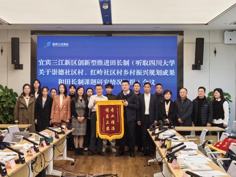 团队授予锦旗并拍照合影。锦旗寄语“蓝图助力振兴梦,校地合作显真情”,“专业精湛,情系三农”突出表现了川大师生以专业能力和敬业精神获得真诚的认可。随后,学院风景园林专业硕士生贾适夷、汪雨彤两位同学代表团队汇报双城街道崇德社区村与江南镇红岭社区村乡村振兴规划成果。