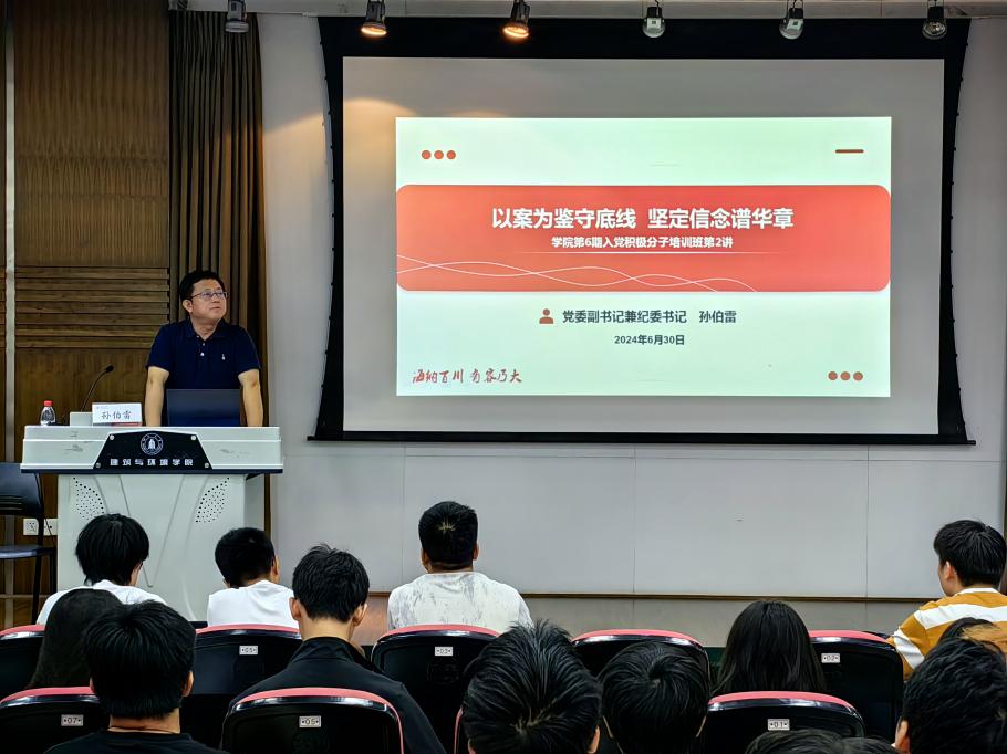 为加强入党积极分子党纪教育,切实增强积极分子党性修养,提高政治觉悟, 6月30日,学院在江安校区学院学术报告厅举办了入党积极分子培训班第六期第2讲。学院党委副书记兼纪委书记孙伯雷作题为“以案为鉴守底线,坚定信念谱华章”的报告。学院辅导员李潇主持本次培训。